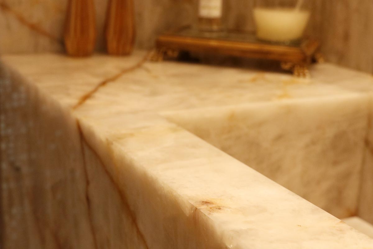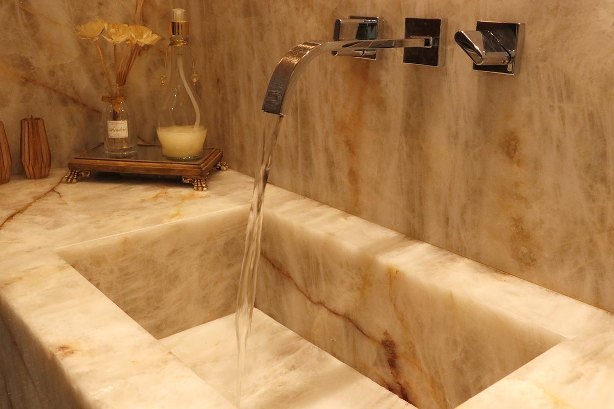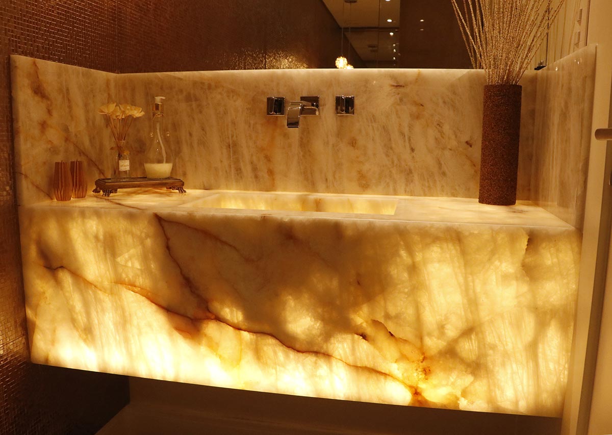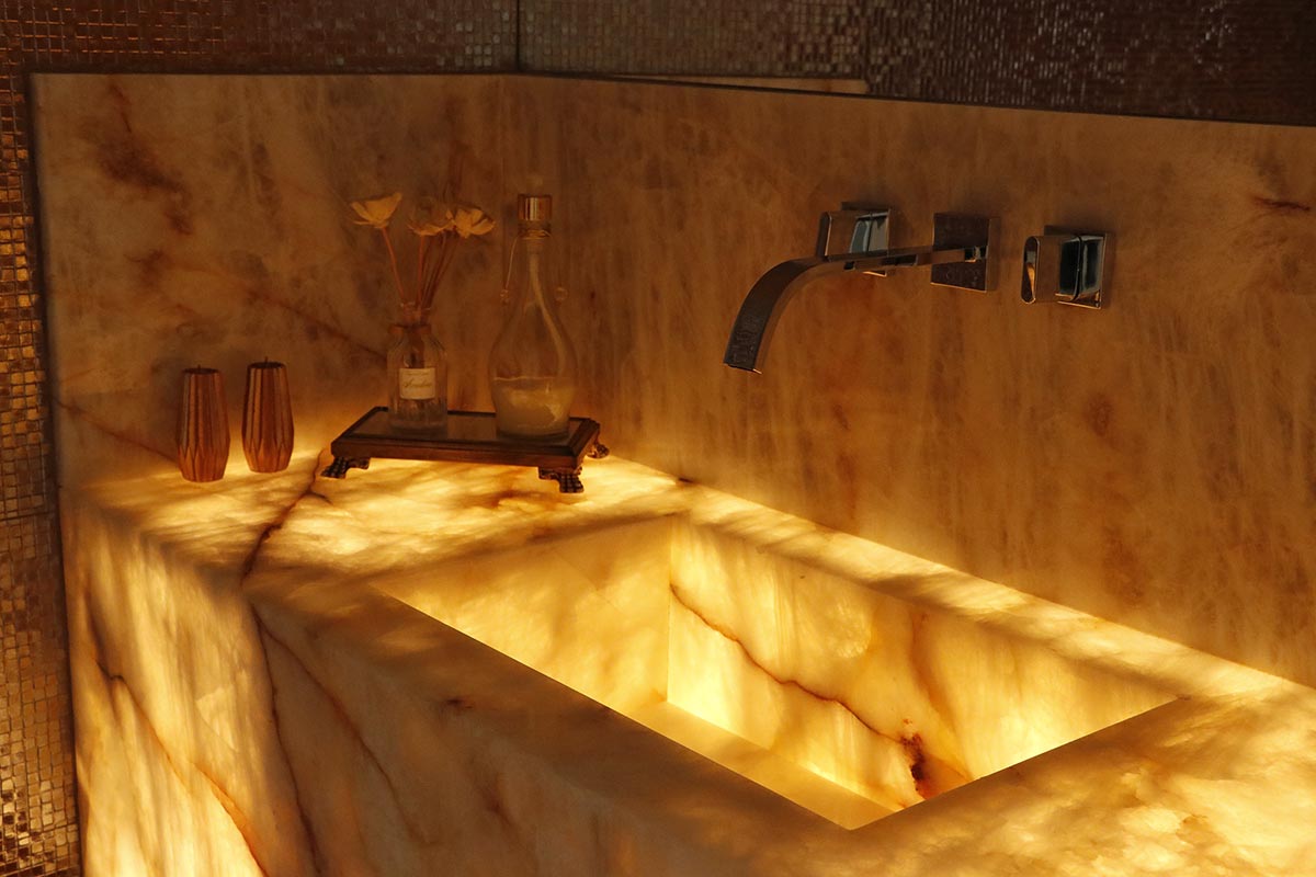 A cliente tinha uma exigência: quero que meus convidados se apaixonem pelo lavabo! Dito isso, foi escolhido uma bancada tipo Cuba Estruturada de Ônix Cristalo com iluminação indireta em toda a bancada. A torneira na rodabanca também chamou atenção, deixando autenticidade no projeto.