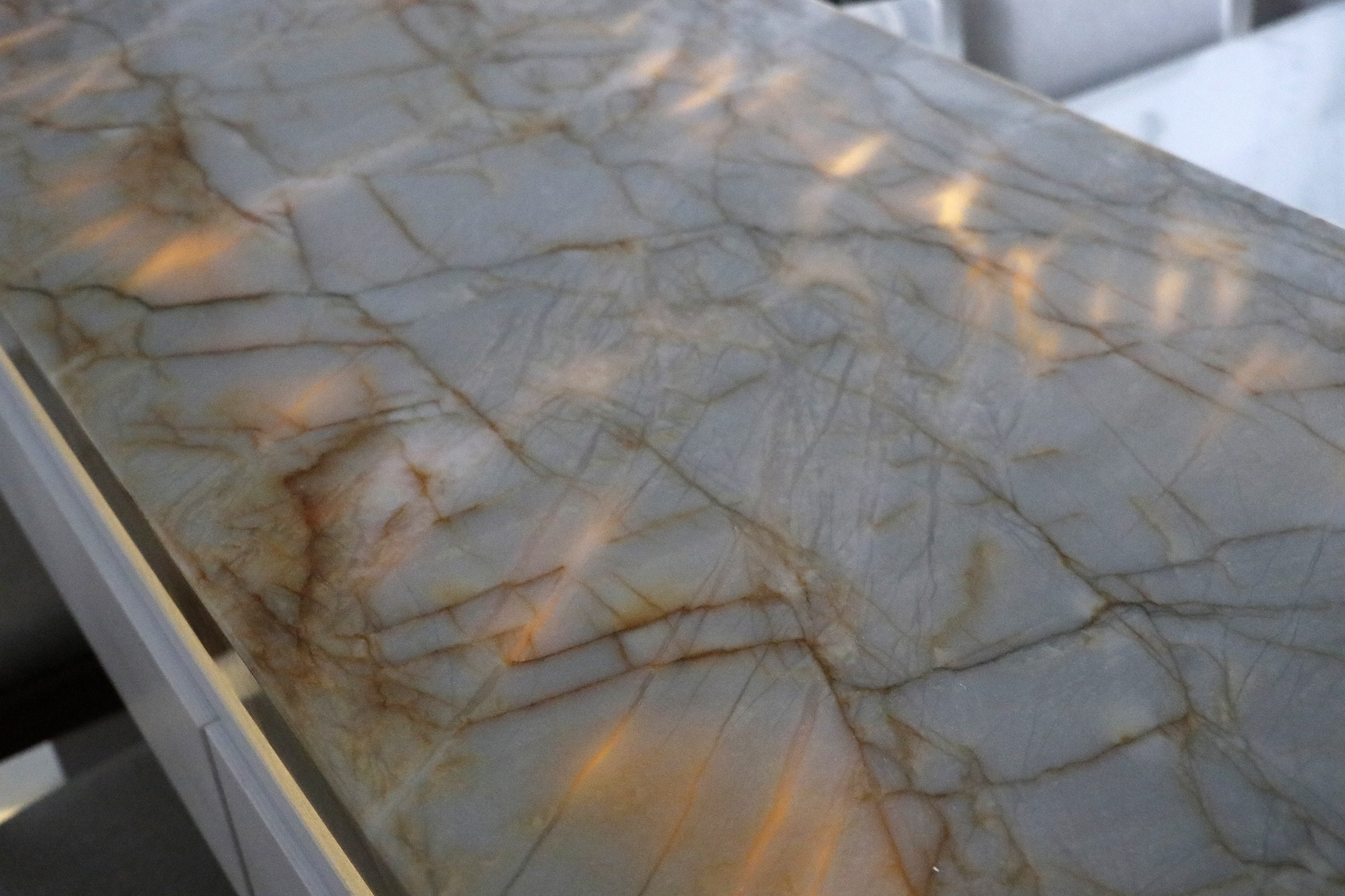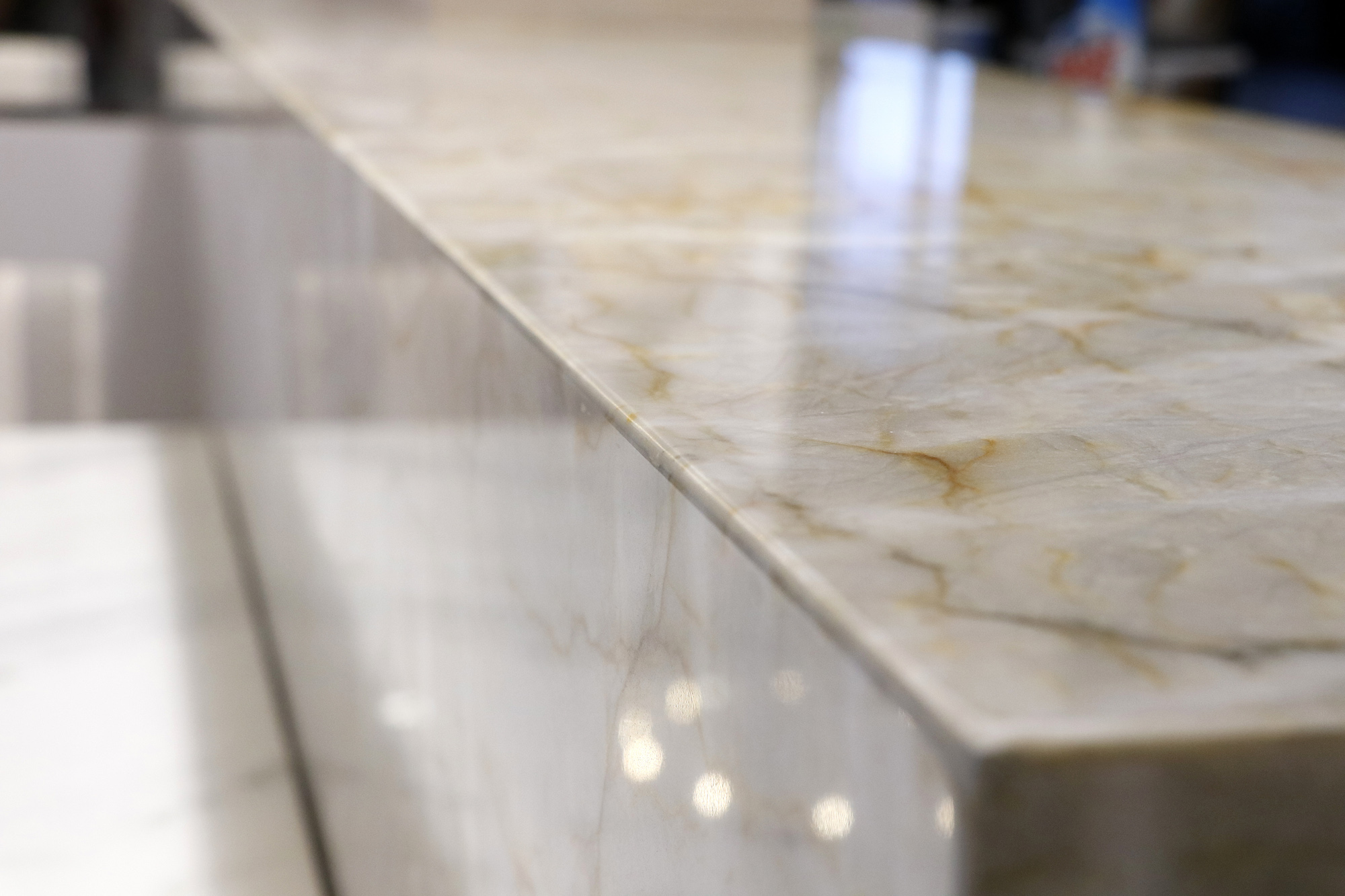 O charme do projeto está na composição dos materiais, em que a arquiteta optou pelo Mármore Carrarinha e o Quartzito Gabbana Gold para dividir os ambientes. A bancada de Quartzito teve iluminação indireta, que realçou os veios naturais da pedra e adicionou mais elegância no ambiente.
